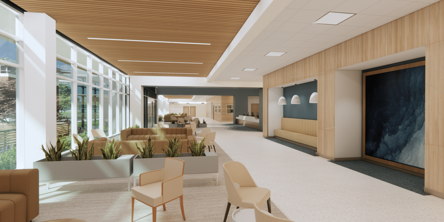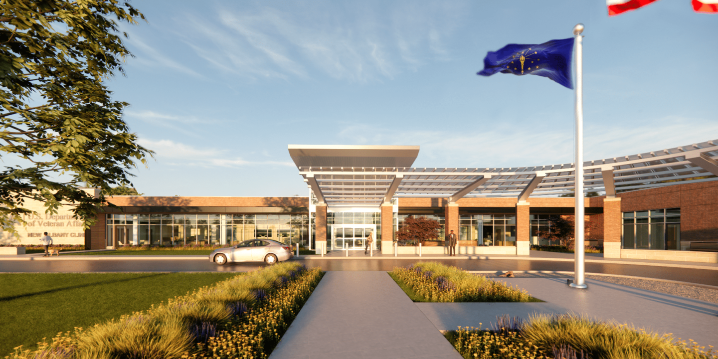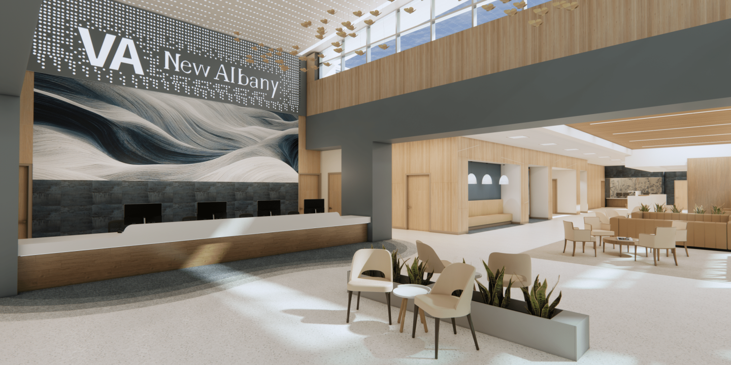 Apogee is delivering full architectural and engineering services for the new New Albany VA Clinic, a modern outpatient facility designed to enhance Veteran care through efficient planning, sustainable systems, and a healing-focused environment. The one-story clinic features a refined PACT-based layout with clear on-stage/off-stage circulation, centralized reception, naturally lit team and group rooms, and a welcoming 20-foot-tall entry lobby.